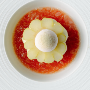 Servi avec une écume de lait infusé au sapin et une glace au sapin baumier, ce dessert évoque une promenade en forêt nordique, fraîche, enveloppante et profondément aromatique.