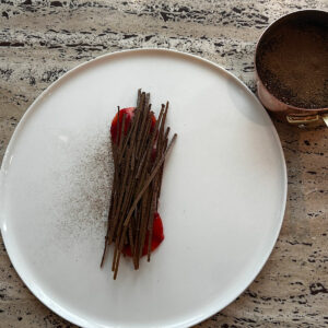 Inspiré de mon parcours en Norvège, ce dessert explore les saveurs boréales et les contrastes de texture, entre profondeur du chocolat et fraîcheur résineuse.